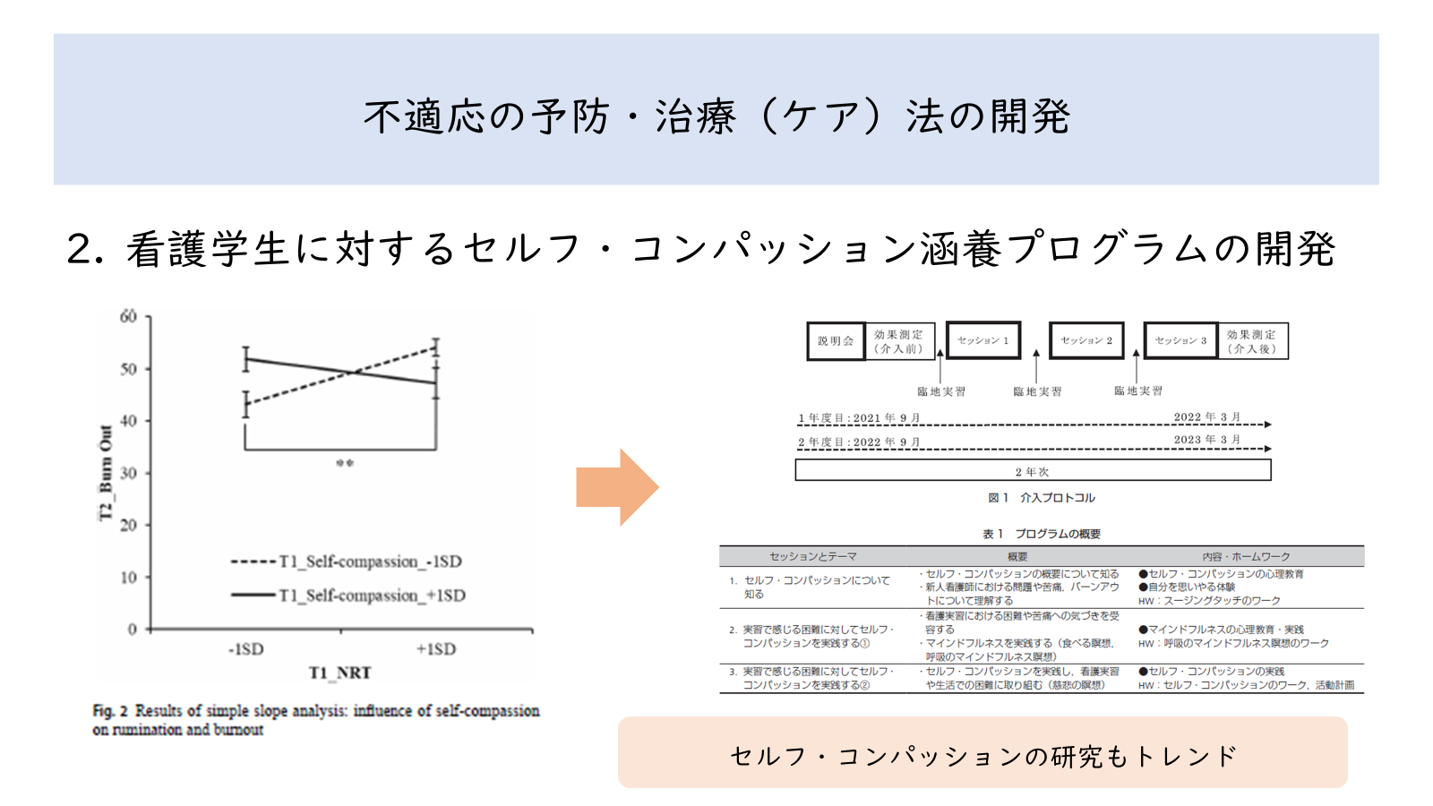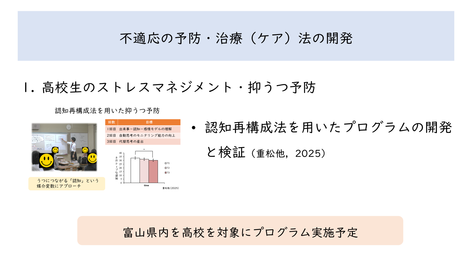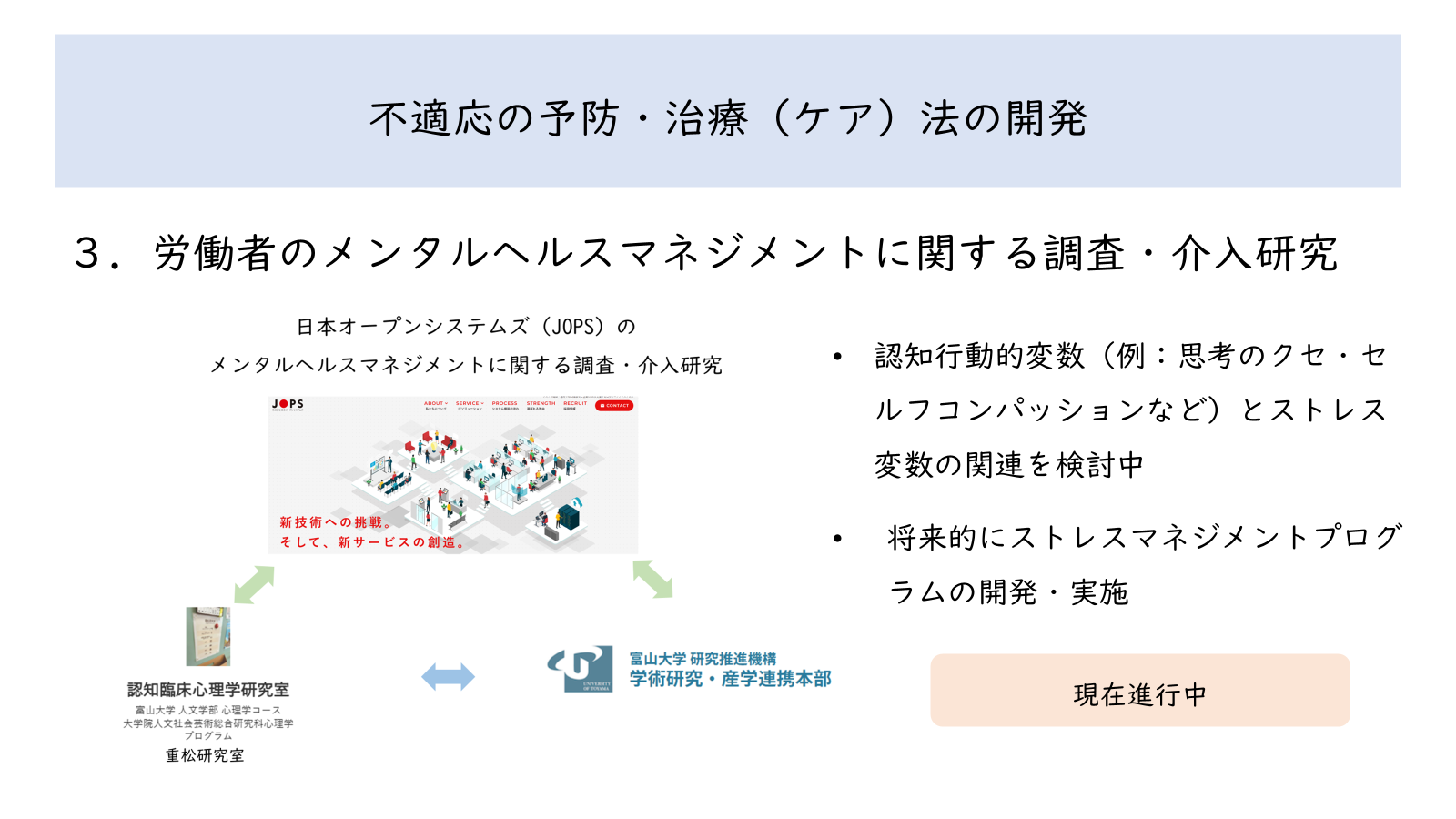 ストレスマネジメント・抑うつ予防プログラムの開発や,企業と連携して労働者のストレスに関する基礎的調査および対策に関する研究を行っています。特に,認知行動的変数(自動思考・認知のクセ・反すう)や,セルフ・コンパッションに重きをおいたプログラムの開発に取り組んでいます。